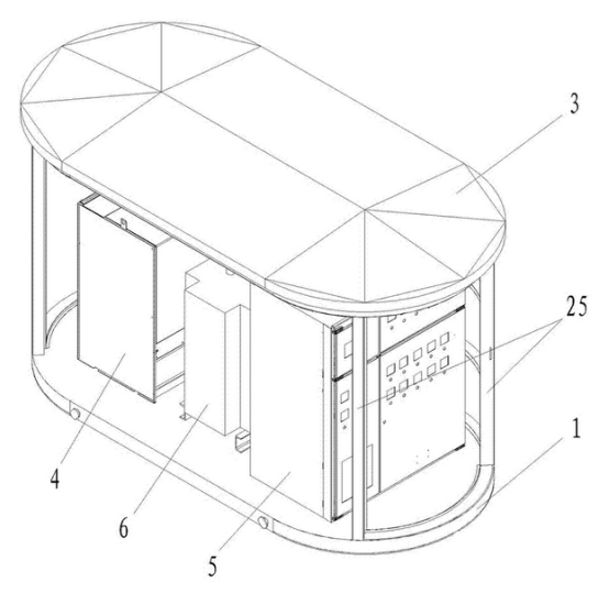 箱體外殼由材料層、龍骨與防護(hù)鋼板層三層組成,可以較好地對變電站內(nèi)的用電設(shè)備進(jìn)行較好地保護(hù);箱體外殼為橢圓柱狀,結(jié)構(gòu)更加緊密牢固。箱體外殼的前表面設(shè)置有雙開門,箱體外殼的表面均勻地設(shè)置有電纜線孔且所述電纜線孔內(nèi)貫穿有電纜線。與周圍的環(huán)境相適應(yīng),同時也提高了變電站的通風(fēng)散熱的效率。