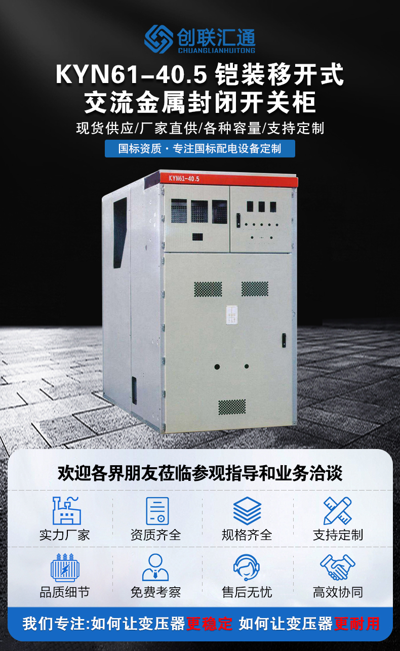 KYN61-40.5型鎧裝移開(kāi)式交流金屬封閉開(kāi)關(guān)柜系三相 交流50Hz,額定電壓40.5kV的戶內(nèi)成套配電裝置。作為發(fā)電廠、變電站及工礦企