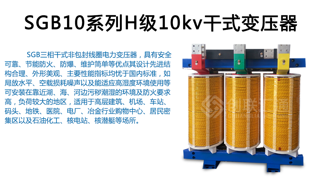 SG(B)10系列H級(jí)絕緣干式變壓器采用優(yōu)質(zhì)環(huán)保材料,先進(jìn)的生產(chǎn)檢測(cè)設(shè)備按嚴(yán)格的工藝生產(chǎn)而成,具有高性能、高安全、承受熱沖擊能力強(qiáng)等特點(diǎn),它適用于防火要求高、負(fù)荷波動(dòng)大以及污穢潮濕的惡劣環(huán)境中。如:高層建筑、商業(yè)中心、住宅小區(qū)、醫(yī)院、化工廠、核電站、船舶及其它安全性要求防火、防爆、防潮的配電網(wǎng)絡(luò)與工礦企業(yè)供配電系統(tǒng)等重要或特殊環(huán)境場(chǎng)所。