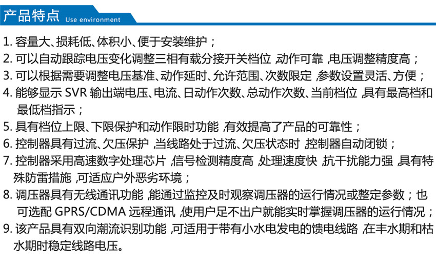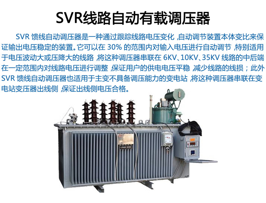 我公司生產(chǎn)的SVR型線路自動調(diào)壓變壓器原理是SVR與10kV 柱上無功自動補(bǔ)償裝置GWJ配合使用,可有效地解決線路電壓低及無功電源不足的問題。SVR 能有效地調(diào)節(jié)電路電壓, GWJ無功補(bǔ)償裝置能有效補(bǔ)償無功,提高功率因數(shù),降低線損,其效果相當(dāng)于一個簡易的柱上變電站,而造價僅為常規(guī)變電站的1/6~1/10。而成本只有變電站的1/6,1/7,而且無需工作人員值班維護(hù)。