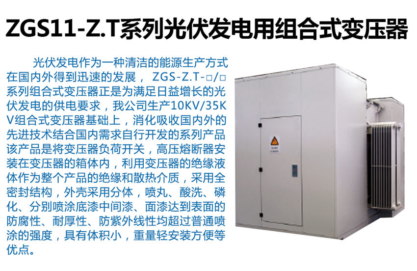 ZGS-Z.T-□/□系列組合式變壓器是消化吸收內(nèi)外的先進技術(shù)結(jié)合內(nèi)需求自行開發(fā)的系列產(chǎn)品,該產(chǎn)品是將變壓器,負(fù)荷開關(guān),高壓熔斷器安裝在變壓器的箱體內(nèi),利用變壓器的絕緣液體作為整個產(chǎn)品的絕緣和散熱介質(zhì),采用全密封結(jié)構(gòu),外殼采用分體,噴丸、酸洗、磷化、分別噴涂底漆、中間漆、面漆達(dá)到表面的防腐性、耐厚性、防紫外線性均超過普通噴涂的強度,具有體積小,重量輕、安裝方便等優(yōu)點。