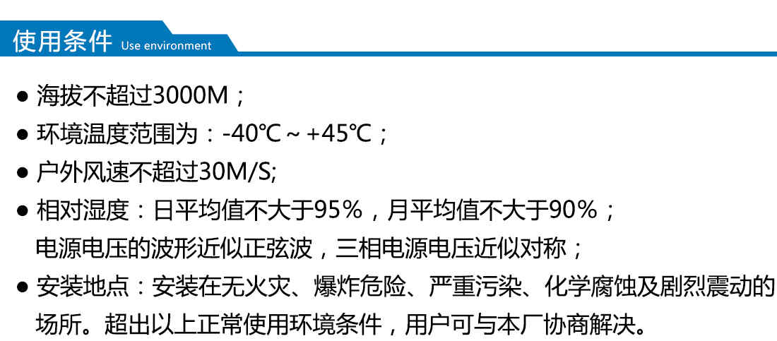適用于自然條件比較惡劣的海灘、草原、荒漠等無火災(zāi)、無嚴(yán)重污染、無化學(xué)腐蝕介質(zhì)和粉塵、無爆炸性危險運(yùn)行環(huán)境,可用于戶外、又可用于戶內(nèi)。
