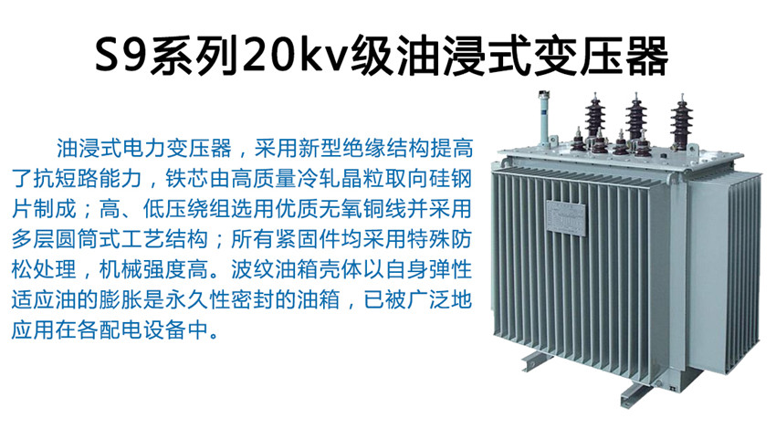 S9系列20kv級油浸式變壓器為配電網(wǎng)絡與工礦企業(yè)供配電系統(tǒng)中的重要設備,在工礦企業(yè)、農(nóng)業(yè)和民用建筑中廣泛使用,也可用于石油、化工行業(yè)中多油污、多化學物質(zhì)的場所。使用環(huán)境:戶外/戶內(nèi)使用,海拔不超過1000m。